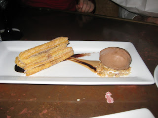 The second dessert we tried was the Piramide de Chocolate - Criollo Chocolate and flourless bizcochode chocolate, with dulce de leche cream and Xoconostale (wild prickly pear sauce). Criollo chocolate is known as a high quality cocoa, used by the top chocolatiers. So, this dessert would have to be delish! The light mousse-like chocolate on top of the crunchier chocolate cake was an excellent contrast. The pear sauce would seemingly be a great pairing -- the tart with the sweet. But I couldn't get paste the extreme tartness of the sauce, even in a small quantity. It was just too over-bearing. But, without the sauce, the chocolate dessert just left me bored. Yes....me bored with chocolate? It seems impossible, but it was true. The Churros blew this dessert away.